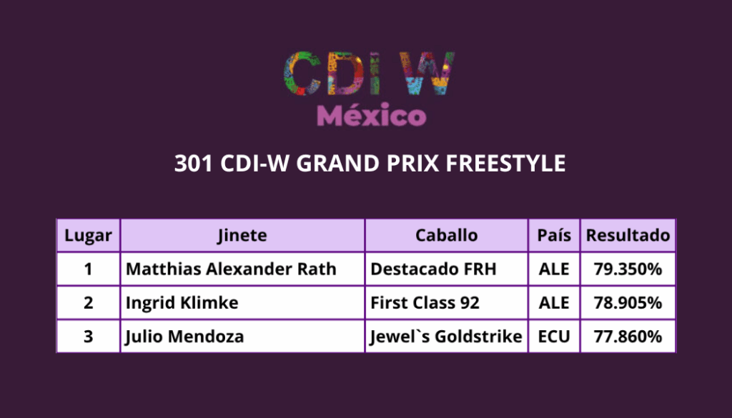El domingo, el Grand Prix Freestyle ofreció un cierre inolvidable. Matthias Alexander Rath con Destacado, Ingrid Klimke con First Class y Julio Mendoza Loor con Jewel’s Goldstrike volvieron a ocupar los tres primeros lugares, emocionando al público con cada nota musical y cada transición.