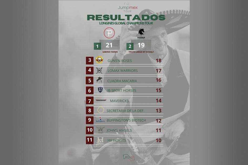 Los equipos ganadores de la primera etapa del Jumpmex Tour, celebrada en el Campo Marte, fueron encabezados por Sabino Farms, que se quedó con el primer lugar con un equipo integrado por Patricio Pasquel Poo, Patricio Pasquel Quintana, Andrés Torres y Nicolaj Hein Ruus; el segundo puesto fue para Trote Largo by Ecoalf, mientras que Gun’s Roses completó el podio en la tercera posición.