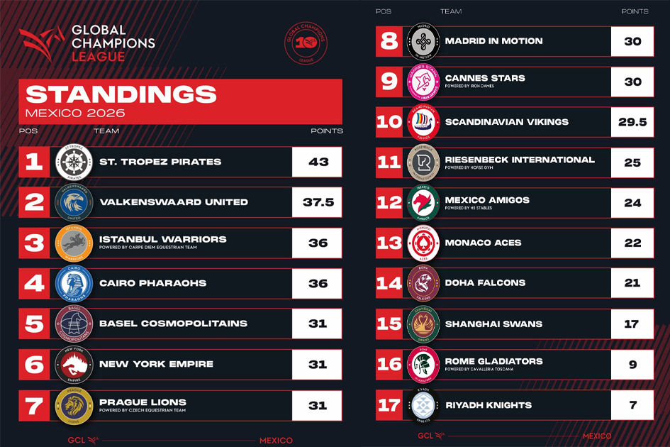 La exigencia aumentó en la Global Champions League (CSI5*, 1.60 m), donde 34 binomios disputaron la primera ronda. El equipo Istanbul Warriors se impuso gracias a Simon Delestre con “Golden Boy DK” (75.72 segundos sin faltas) y Abdel Saïd con “Wathnan Bonne Amie”, acumulando 154.45 segundos. Prague Lions terminó segundo con Derin Demirsoy en “CSF Whipper Snapper VDL” y Pieter Devos con “Primo DV”, registrando 160.23, mientras que Basel Cosmopolitans fue tercero con Olivier Philippaerts en “Hippster SV” y Zascha Nygaard con “Charino PS” en 163.68.
