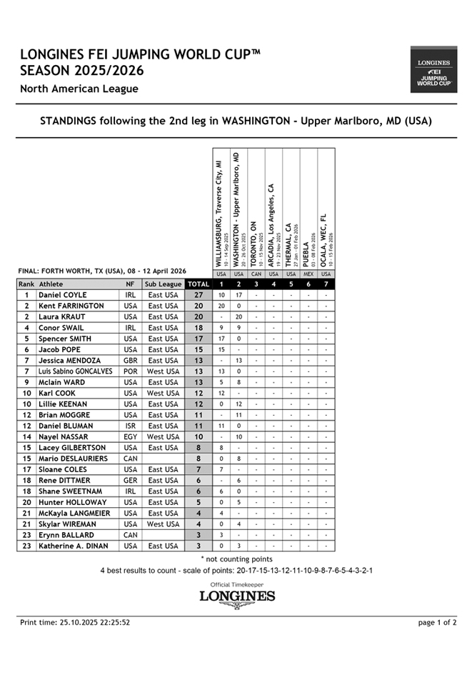 Tras esta etapa, el ranking de la North American League 2025-2026 queda encabezado por Daniel Coyle (IRL) con 27 puntos, seguido de Kent Farrington (USA) y Laura Kraut (USA) con 20 puntos cada uno, Conor Swail (IRL) con 18 puntos, y Spencer Smith (USA) con 17 puntos.